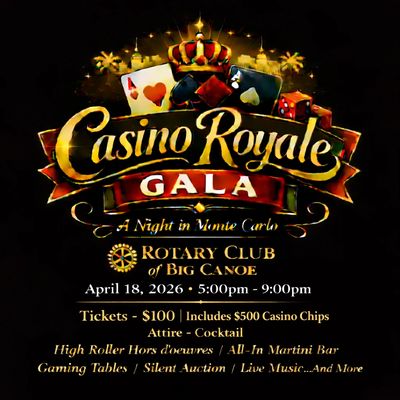 This one-page flyer provides key event details and highlights for the Rotary Club of Big Canoe “Casino Royale Gala” including silent auction, DJ music, roving magic show, red-carpet photo drop, buffet/dessert bar, martini bar and other paid beverages, bourbon tastings/cigars, plus 12 casino gaming tables and fun contests like a wine pull and raffle board.